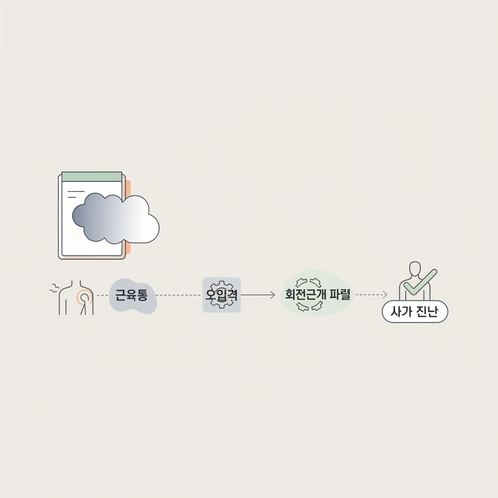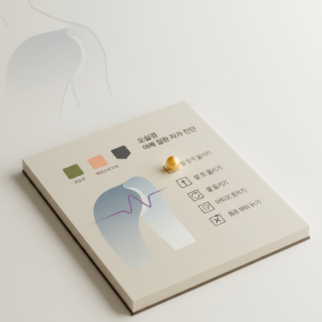 통증이 욱신거리는지, 찌릿한지, 뻐근한지 등 통증의 종류를 파악해보세요. 근육통은 보통 뻐근하거나 결리는 느낌이 강하며, 회전근개 파열은 날카로운 통증이나 찌릿한 느낌을 동반하는 경우가 많습니다. 오십견은 묵직하고 조이는 듯한 통증과 함께 움직임 제한이 두드러집니다.